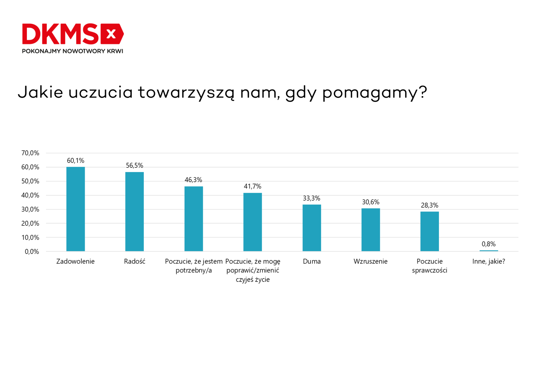 Pomaganie innym dostarcza nam wielu pozytywnych emocji. Dominującymi uczuciami, wskazanymi przez uczestników badania, są zadowolenie – 60 proc. oraz radość – 57 proc. Zrobienie czegoś dla drugiego człowieka sprawia, że czujemy się też potrzebni (46 proc.) lub możemy poprawić/zmienić czyjeś życie (42 proc.). Co trzeci z respondentów pomagając dumę (33 proc.) lub wzruszenie (31 proc.).
