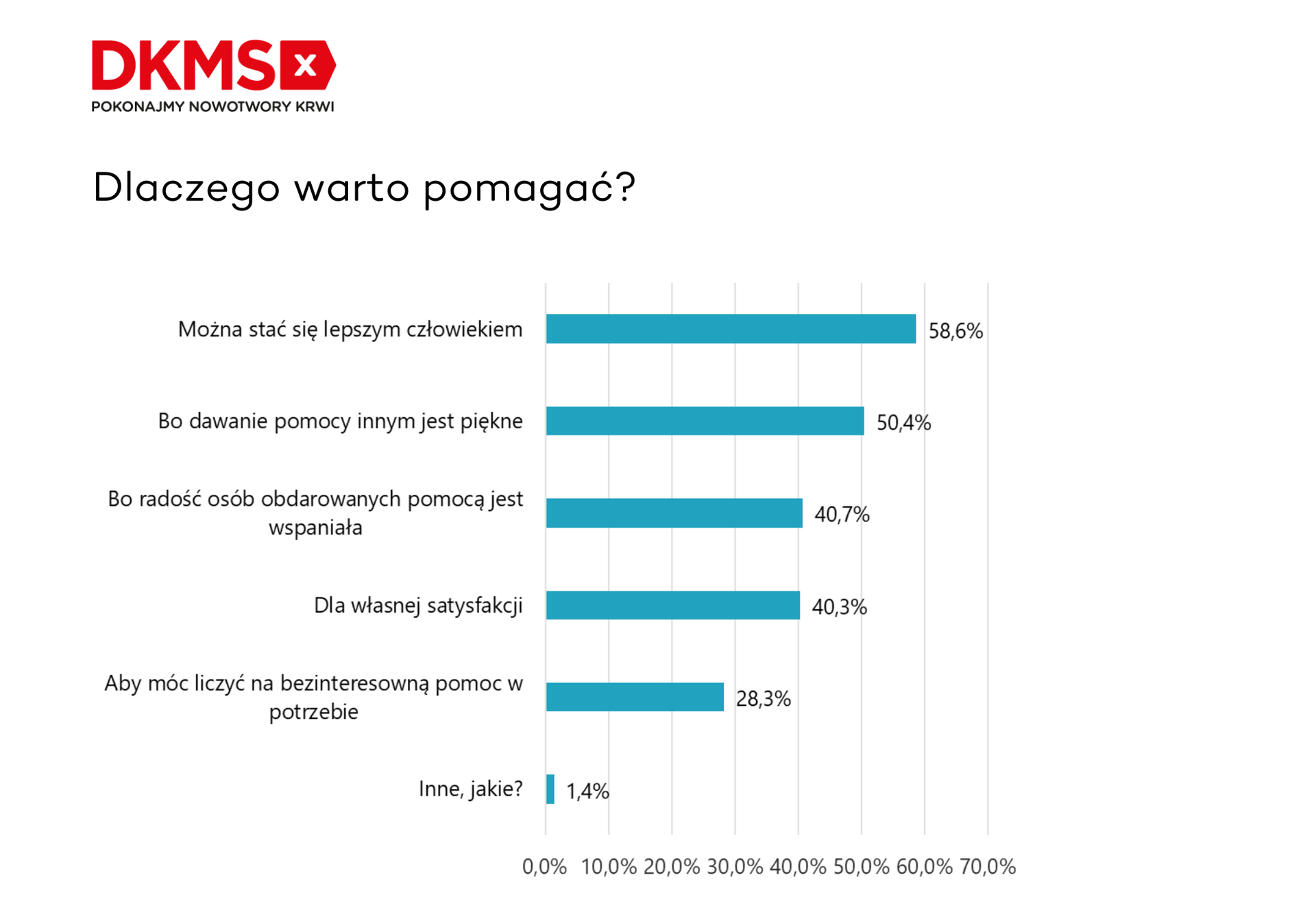Każdy z nas ma swój powód, by pomagać. I każdy z nich jest dobry. Dla 59 proc. badanych najważniejszym z nich był fakt, że dzięki temu można stać się lepszym człowiekiem, a połowa uczestników badania była zdania, że dawanie pomocy innym jest piękne. Nieznacznie powyżej 40 proc. respondentów uważało, że warto pomagać, ponieważ radość osób obdarowanych pomocą jest wspaniała (41 proc.) lub ze względu na własną satysfakcję (40 proc.) Kwestia otrzymania bezinteresownej pomocy w potrzebie okazała się być istotna dla 28 proc. Polaków.