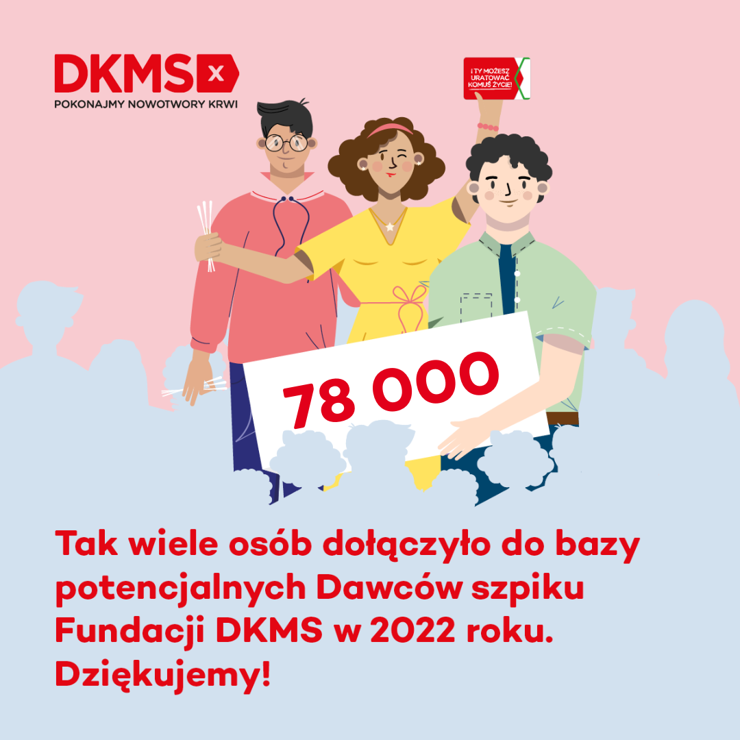 Rejestracja w bazie potencjalnych dawców szpiku zwiększa szanse na znalezienie „bliźniaka genetycznego” dla osoby chorej, dla której niespokrewniony dawca szpiku jest często jedyną szansą na wyzdrowienie. W 2022 roku 78 000 osób podjęło tę ważną decyzję i wyraziło chęć pomocy drugiemu człowiekowi, wypełniając formularz rejestracyjny. Dzięki temu, pod koniec roku w Ośrodku Dawców Szpiku Fundacji DKMS było łącznie 1 874 117 zarejestrowanych dawców szpiku.
