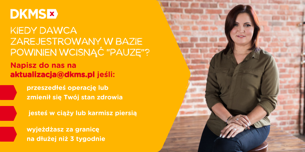 Jeśli jesteśmy potencjalnym dawcą szpiku, a zmianie uległ: nasz stan zdrowia, mamy zaplanowane zabiegi bądź operację, jesteśmy w ciąży lub karmimy piersią, to powinniśmy zgłosić takie kwestie na adres medyczne@dkms.pl. Na jakiś czas zostaniemy zablokowani w bazie i nie będziemy widoczni dla ośrodków poszukiwawczych.