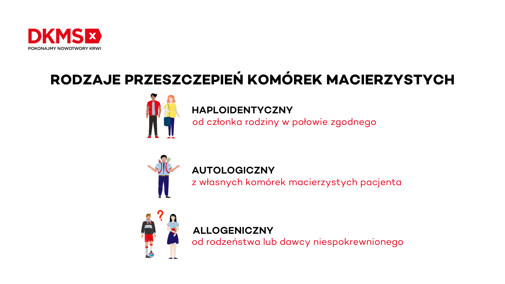 Przeszczep allogeniczny to rodzaj transplantacji, w której dawcą jest osoba spokrewniona z pacjentem lub niespokrewniona. Tylko 25 proc. chorych znajduje zgodnego dawcę rodzinie – pozostałe 75 proc. chorych wymaga przeszczepienia szpiku od dawcy niespokrewnionego, którego poszukuje się pośród osób zarejestrowanych w bazach dawców.