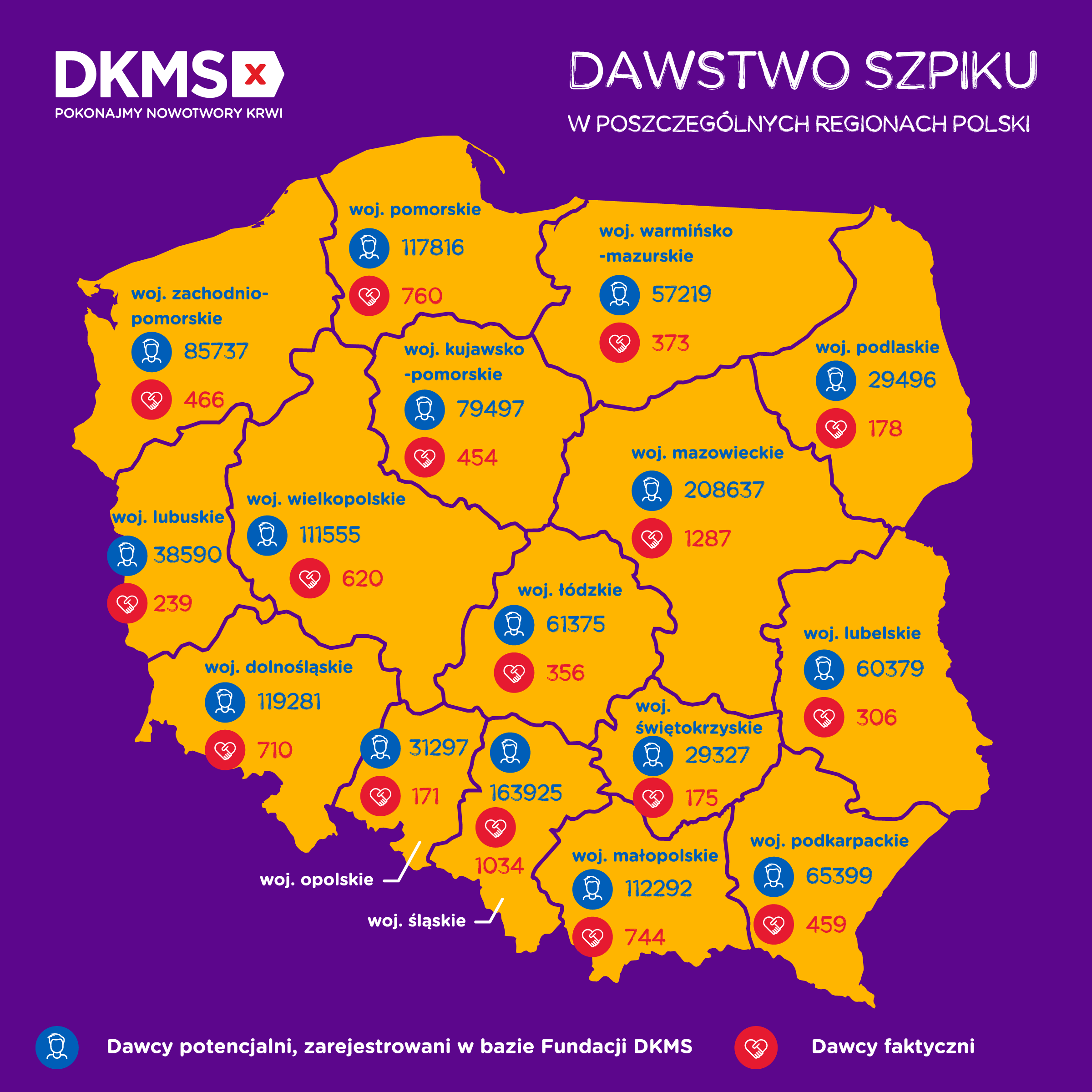 Aktualnie w bazie Dawców szpiku Fundacji DKMS zarejestrowanych jest 1 770 345 potencjalnych Dawców szpiku, z których dotychczas 8692 zostało Dawcami faktycznymi. Każde z 16 województw ma wśród swoich mieszkańców osoby, które były gotowe oddać cząstkę siebie, by pomóc nieznajomej osobie, chorującej na nowotwór krwi. Najwięcej Dawców faktycznych - bo aż 1287 - pochodzi z województwa mazowieckiego.