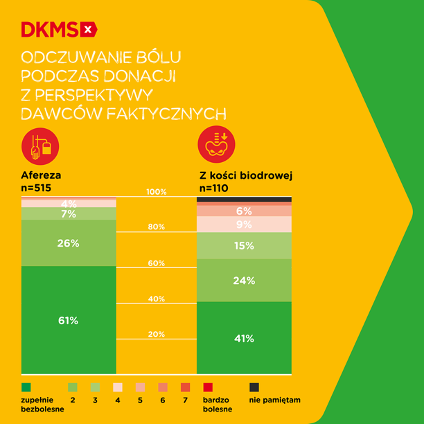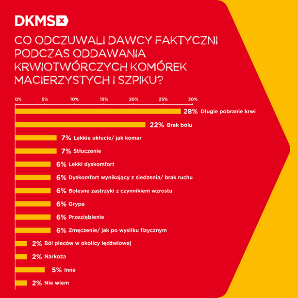 A co z bólem? Obawa przed nim to jeden z głównych czynników, powstrzymujących wiele osób przed rejestracją w bazie dawców szpiku. O tym, że nie ma się czego bać, najlepiej świadczą opinie dawców faktycznych, którzy donację mają już za sobą – a w bazie Fundacji DKMS jest już ich ponad 13 tysięcy! Ból związany z oddaniem szpiku z talerza kości biodrowej porównują do dolegliwości występujących przy stłuczeniu o kant szafki. W przypadku aferezy odczuwalny dla dawcy jest jedynie moment wkłucia wenflonów w doły łokciowe, a w trakcie przyjmowania zastrzyków pobudzających pracę szpiku - bóle kostno-stawowe jak przy infekcji grypowej.