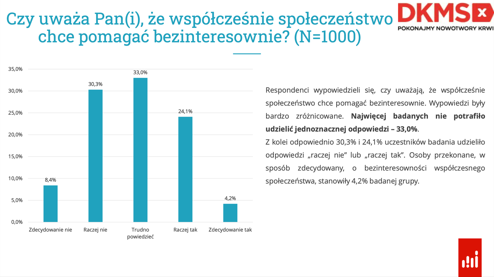 Chociaż aż 83% respondentów zadeklarowało, że w ostatnim czasie zrobiło coś dla kogoś bezinteresownie, to gdy uczestnicy badania musieli wypowiedzieć się o pomocy w kontekście społeczeństwa, odpowiedzi były zróżnicowane i pojawiła się w nich zauważalna niepewność.