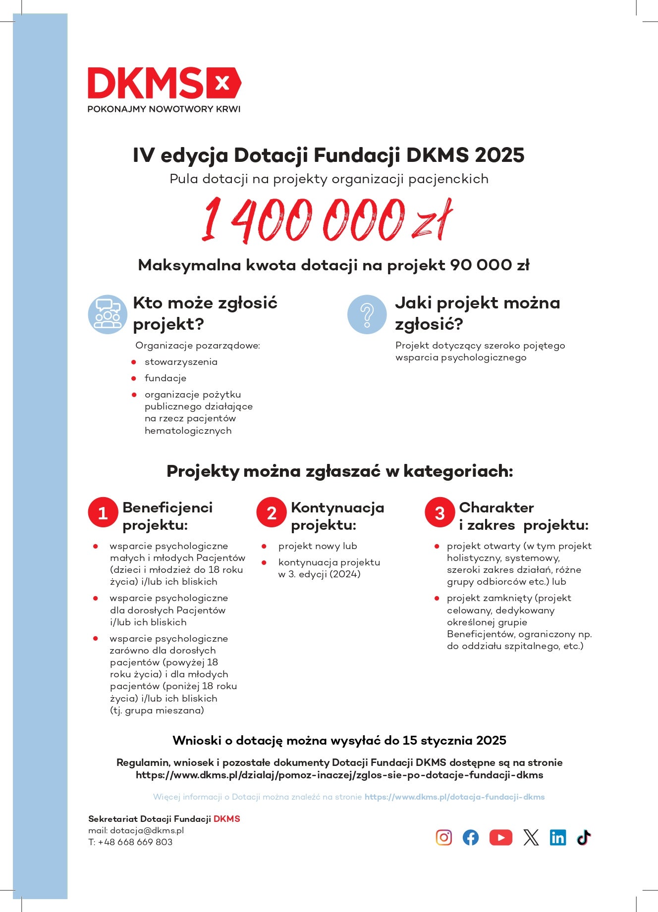 Fundacja DKMS rozpoczyna przyjmowanie wniosków w ramach 4. edycji Dotacji Fundacji DKMS. Projekt daje możliwość organizacjom pozarządowym z całej Polski pozyskania środków na realizację inicjatyw kierowanych do pacjentów hematologicznych i ich bliskich w szerokim zakresie wsparcia psychologicznego. Pula środków do rozdysponowania wynosi 1,4 mln zł. Zgłoszenia można składać od 10 grudnia 2024 r. do 15 stycznia 2025 r.