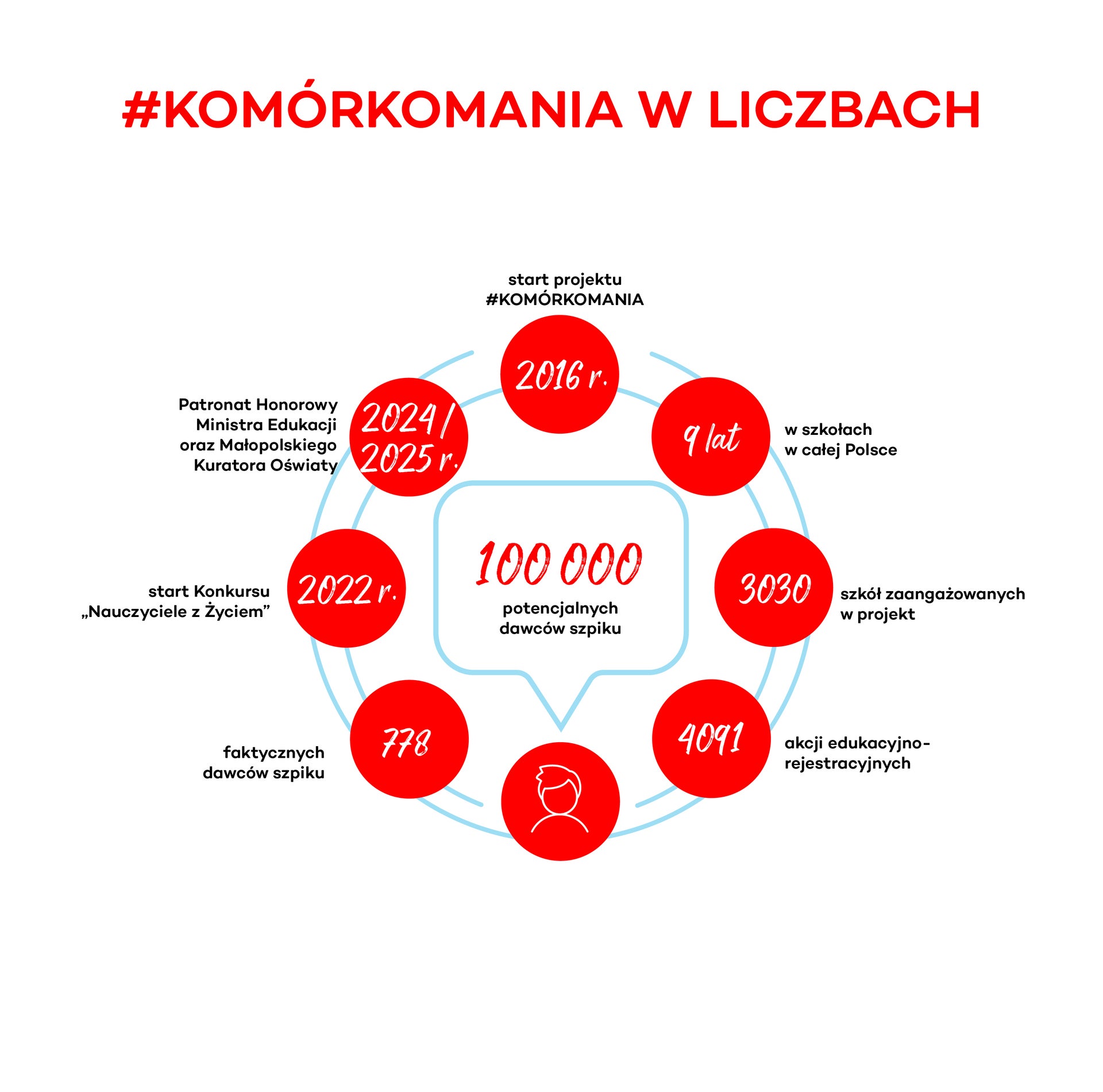 #KOMÓRKOMANIA to przede wszystkim lekcja empatii i solidarności z osobami chorującymi na nowotwory krwi, ale także wprowadzenie do szkół tematu dawstwa szpiku, który buduje w młodych osobach poczucie odpowiedzialności społecznej. Dzięki inicjatywie Fundacji DKMS uczniowie stają się świadomymi dawcami oraz dawczyniami i realnie mogą wspierać polską transplantologię. Projekt został objęty honorowym patronatem Ministra Edukacji na rok szkolny 2024/2025 oraz Małopolskiego Kuratora Oświaty.