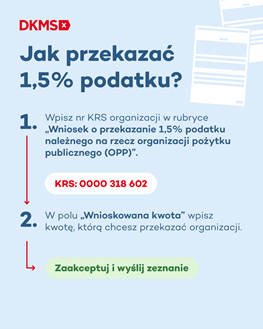 Przekaż 1,5% podatku Fundacji DKMS – środki te wspierają działania związane z rejestracją potencjalnych Dawców szpiku oraz z zapewnieniem pacjentom komfortu – w tym zarówno fizycznego, jak i psychicznego (na przykład poprzez doposażanie i remonty w ośrodkach hematologicznych czy zapewnianie wsparcia psychoonkologa dla chorego oraz jego najbliższych).