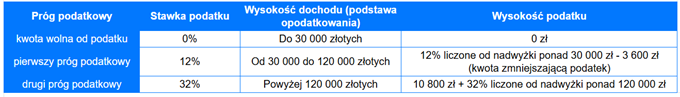 Pierwszy próg podatkowy to 12%. Obejmuje dochody do 120 000 złotych.