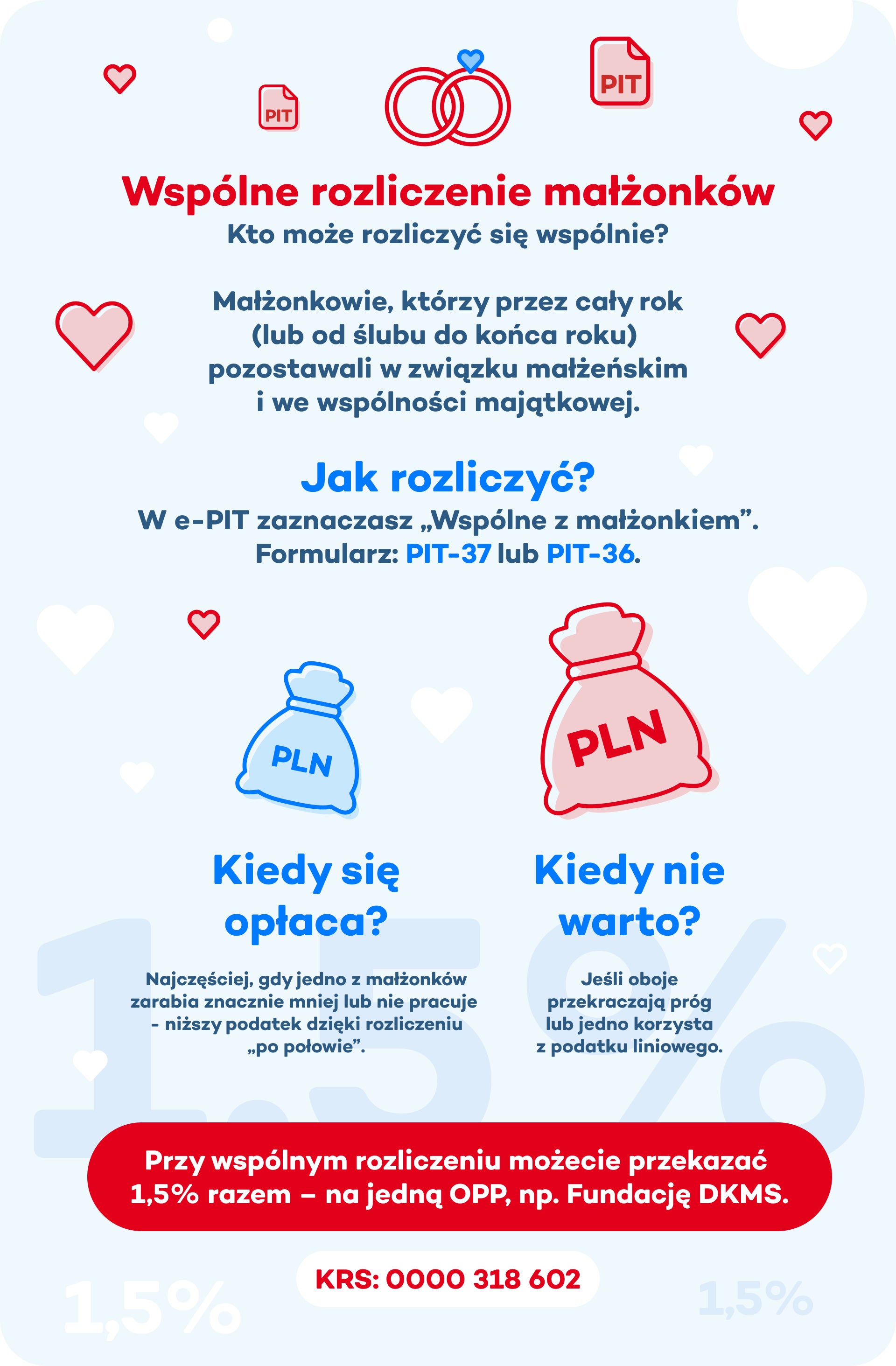 Wspólne rozliczenie nie wyklucza przekazania 1,5% podatku na organizację pożytku publicznego. Wystarczy wskazać numer KRS w deklaracji – bez dodatkowych kosztów. Zachęcamy do przekazania 1,5% podatku dla DKMS: nasze działania polegają nie tylko na organizacji i obsłudze bazy dawców, ale również na wielopłaszczyznowym wsparciu pacjentów onkologicznych – od zapewnienia im pomocy psychologa, aż po przeprowadzanie remontów i doposażanie ośrodków hematologicznych.