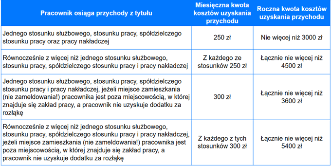 Miesięczne koszty uzyskania przychodu: 250 zł z każdego stosunku pracy