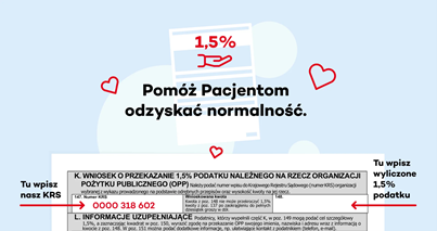 Przekazanie 1,5% podatku to prosty gest, który ma ogromną moc. Nic Cię nie kosztuje, a dla Pacjentów z nowotworami krwi może oznaczać szansę na życie. Wystarczy, że w swoim zeznaniu podatkowym wpiszesz numer KRS: 0000318602.
