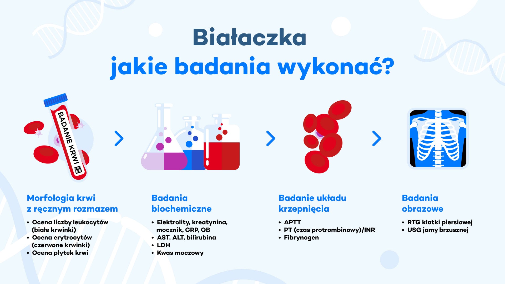 Jeśli po wykonaniu podstawowych badań ogólnych u Pacjenta zostanie wstępnie rozpoznana białaczka, należy zlecić szereg badań specjalistycznych. Często w celu potwierdzenia rozpoznania konieczne jest wykonanie biopsji szpiku. Uzyskany w ten sposób materiał poddaje się badaniom wysokospecjalistycznym, takim jak: