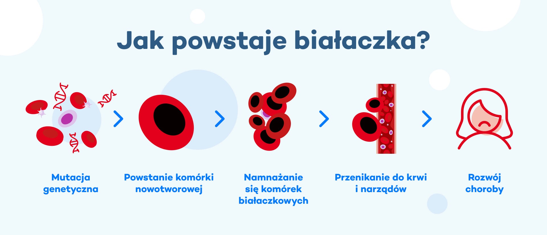Jak powstaje białaczka i skąd się bierze? Rozwój choroby związany jest ze zmianami ilościowymi i jakościowymi białych krwinek we krwi, szpiku i narządach wewnętrznych. Skład krwi staje się zaburzony, a przez to układ krwiotwórczy nie może prawidłowo pełnić swoich funkcji. Prześledź proces powstawania krwi oraz wadliwych komórek, by zrozumieć, skąd się bierze białaczka.