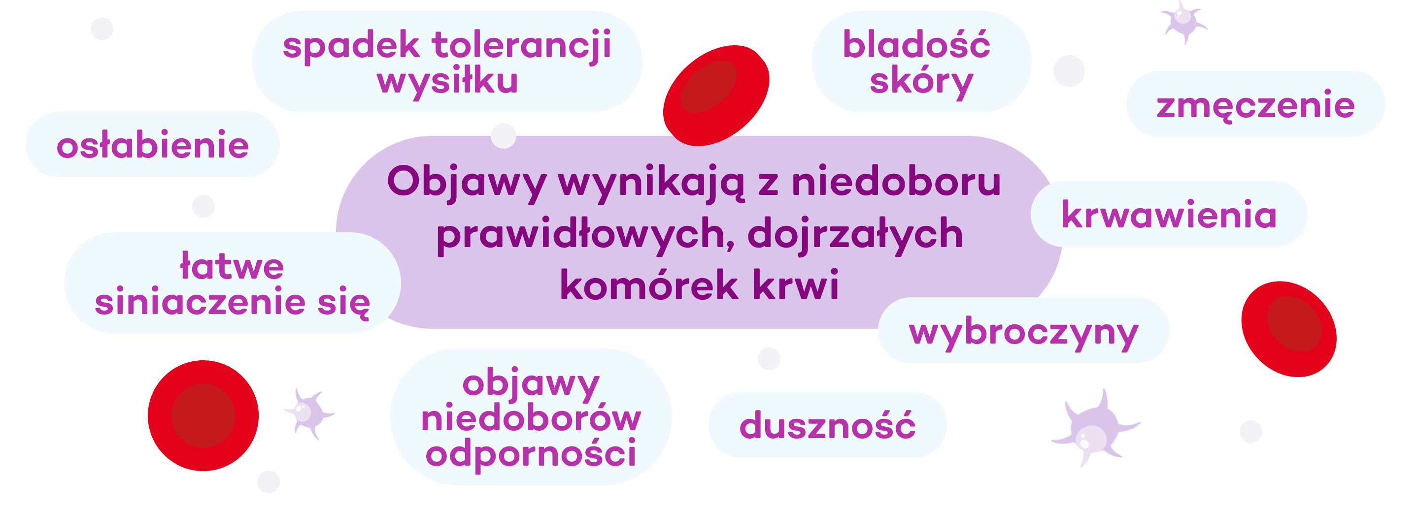 Niedokrwistość (czyli zbyt niska ilość krwinek czerwonych i Hemoglobiny), małopłytkowość (za mała liczba trombocytów) oraz granulocytopenia (obniżony poziom liczby granulocytów we krwi) to główne oznaki zespołów mielodysplastycznych. Prowadzą one do wystąpienia u chorego objawów, które nie są jednak charakterystyczne tylko dla MDS. Są to przede wszystkim: