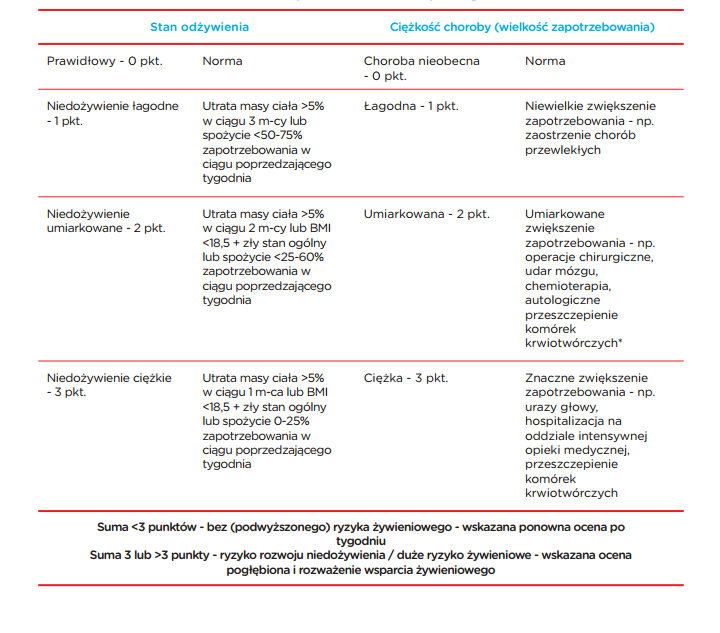 W przypadku obecności Pacjenta na oddziale szpitalnym, personel medyczny powinien przeprowadzić pierwszorazową ocenę stanu odżywienia w pierwszym dniu przyjęcia i powtarzać ją regularnie do momentu wypisu. Zwykle jest to ocena przesiewowa, która według ustawy ma być przeprowadzana na formularzach SGA (subiektywna globalna ocena stanu odżywienia – ryc. 1) oraz NRS 2002 (skala ryzyka związanego ze stanem odżywienia – ryc. 2). Prawidłowo przeprowadzona ocena stanu odżywienia składa się z oceny parametrów antropometrycznych Pacjenta (masy ciała, obecności obrzęków, obwodu ramienia), biochemicznych (np. stężenie albumin w osoczu krwi) oraz ogólnej oceny aktualnych możliwości spożywania posiłków i jakości diety. W przypadku oceny stanu odżywienia żaden pojedynczy parametr nie jest w pełni miarodajny. Z tego powodu istotna jest uważna rozmowa z Pacjentem, przeprowadzana przez dietetyka lub wykwalifikowanego w tym zakresie lekarza lub pielęgniarkę, która pozwala często na wychwycenie zmian, związanych z zachowaniami żywieniowymi, które nie są jeszcze uchwytne w parametrach obiektywnych, a mogą wpłynąć na szybkie pogorszenie się stanu odżywienia [9-14].