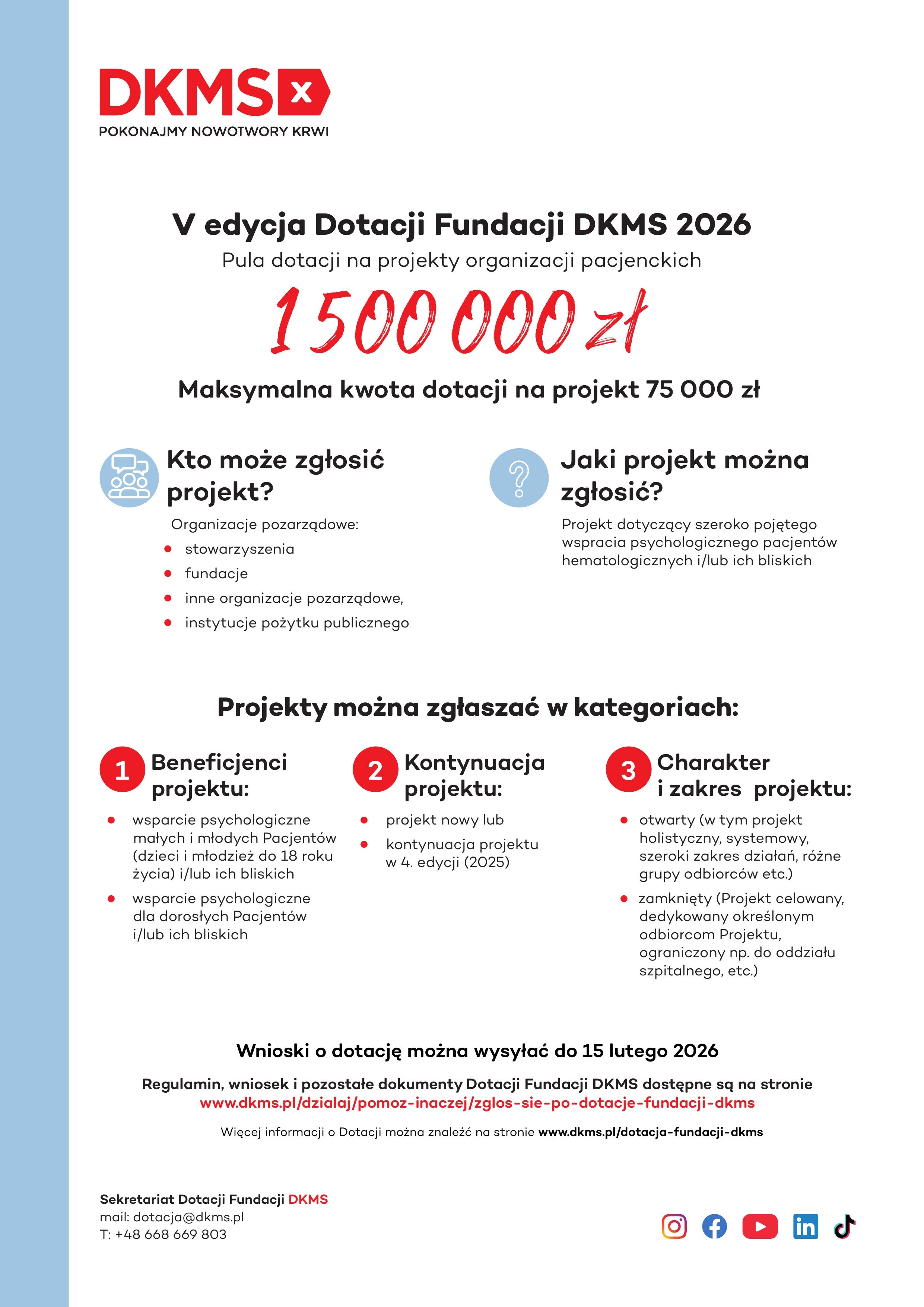 Całkowita kwota dotacji w ramach V edycji Dotacji Fundacji DKMS w 2026 roku to 1.500.000 zł, przy czym wartość jednej dotacji wynosić będzie maks. 75 000 zł.