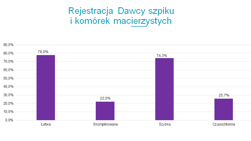Zdecydowana większość respondentów wie na czym polega rejestracja w bazie Dawców szpiku i komórek macierzystych i uważa, że jest ona łatwa (78,0%) i szybka (74,3%). Cały proces rejestracji przebiega w kilku krokach: