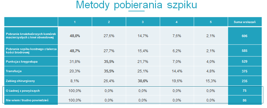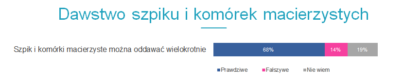 Co trzeci Polak sądzi, że szpik i krwiotwórcze komórki macierzyste pobiera się podczas punkcji kręgosłupa lub transfuzji krwi (takie odpowiedzi wskazało po 35,5 proc.). Tymczasem istnieją dwie metody pobrania szpiku i komórek macierzystych do transplantacji.