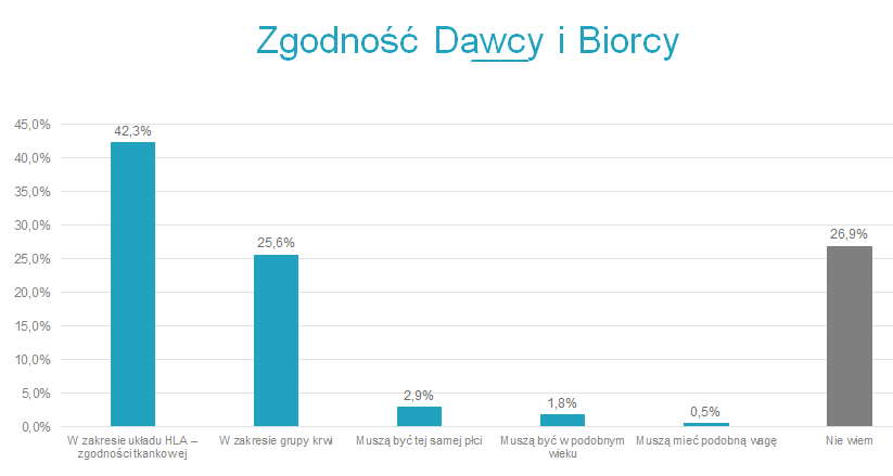 Aż 42 proc. respondentów, biorących udział w badaniu, wiedziało, że Dawca i Biorca muszą być zgodni ze sobą w zakresie tzw. układu HLA – układu zgodności tkankowej. Blisko 26 proc. ankietowanych błędnie uważało, że grupa krwi Dawcy i Biorcy musi być taka sama, aby mogło dojść do przeszczepienia. Jednoznacznej odpowiedzi na to pytanie nie potrafiło udzielić blisko 27 proc. ankietowanych.