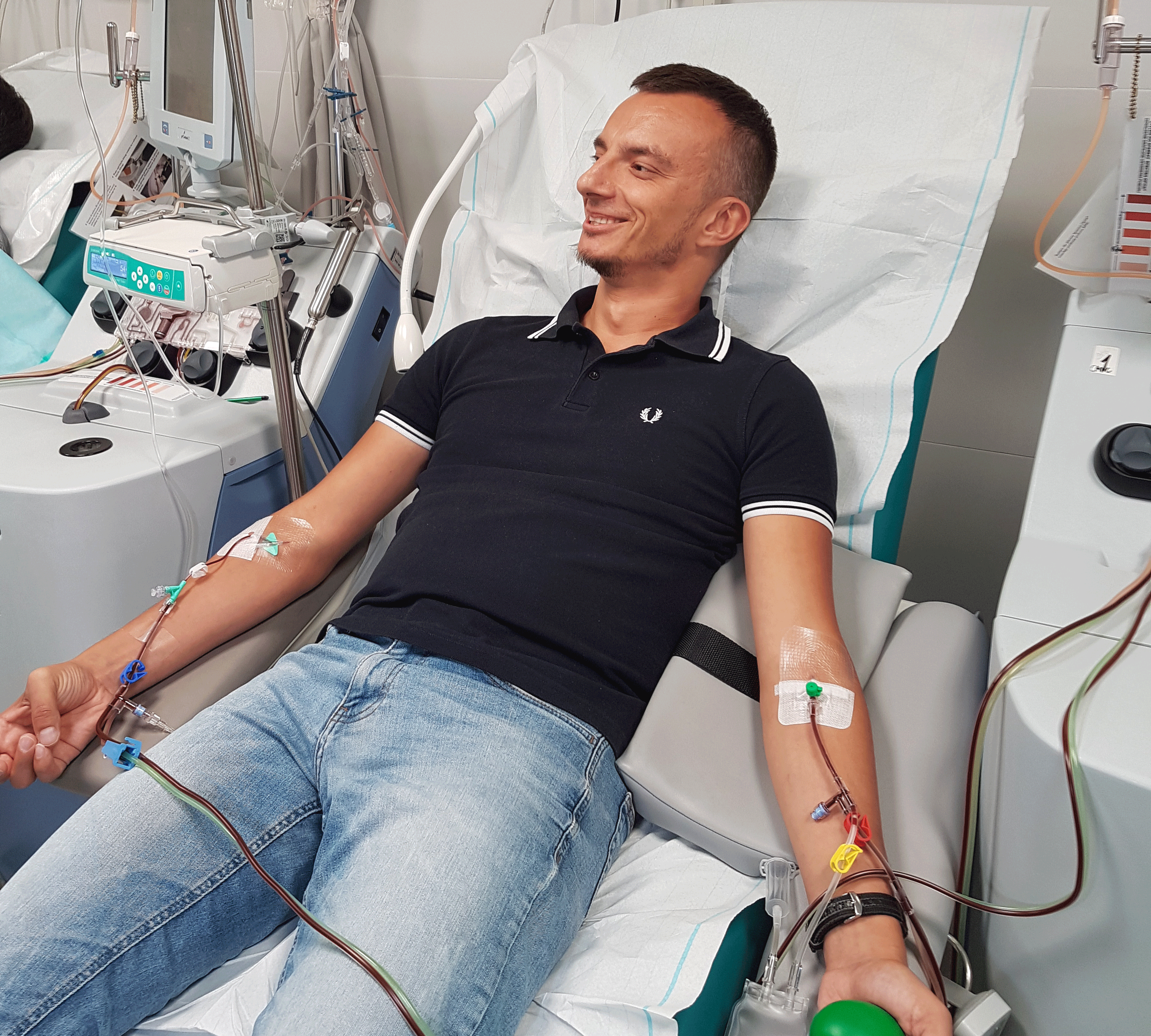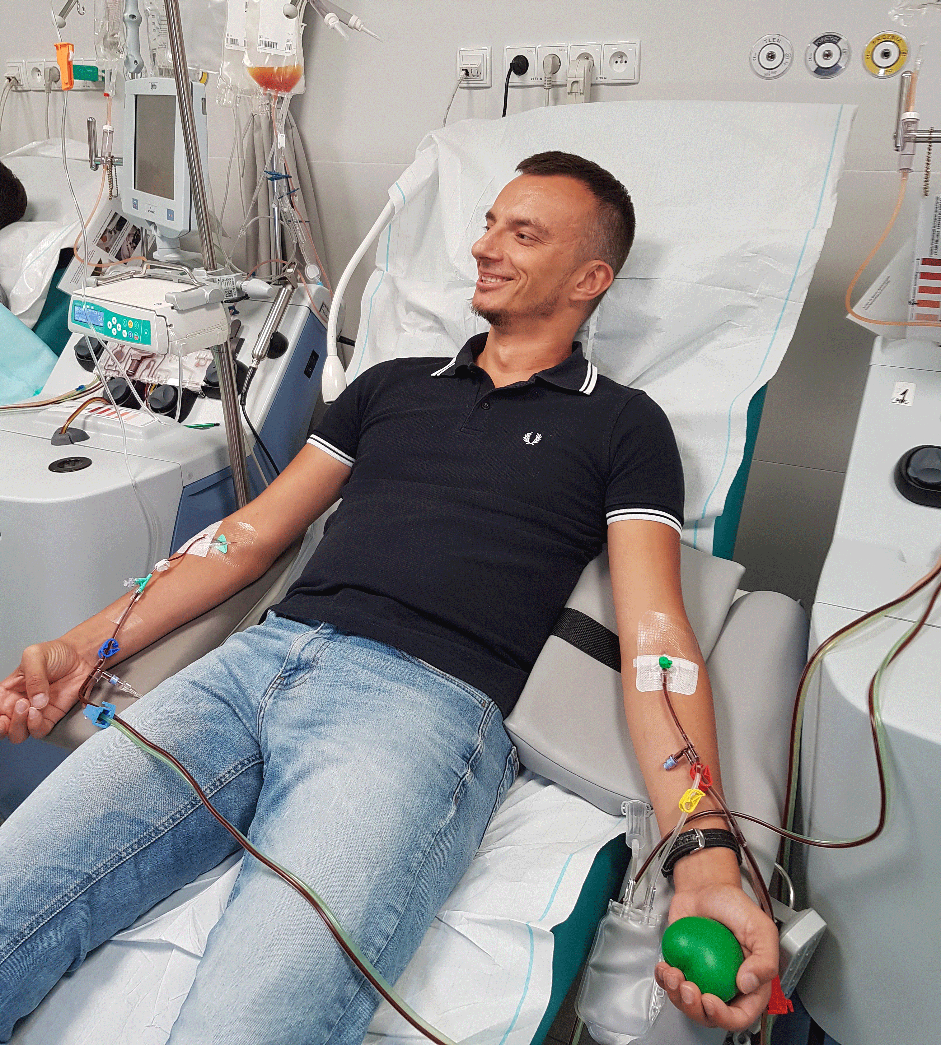 Łukasz wie, że oddał cząstkę siebie dla tej samej osoby - mężczyzny z Francji, którego stan zdrowia wymaga ponownego przeszczepienia. Pierwsze pobranie szpiku w 2018 roku nastąpiło u Łukasza metodą z talerza kości biodrowej, natomiast dziś Dawca oddał krwiotwórcze komórki macierzyste z krwi obwodowej – czyli za pomocą drugiej, częściej stosowanej, bo aż w 80% pobrań – metody.