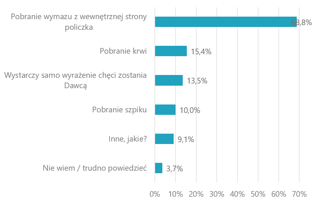 Ponad połowa wszystkich respondentów (57 proc.), którzy wzięli udział w badaniu wie, na czym polega rejestracja w bazie Dawców. Grupa ta została poproszona także o wskazanie konkretnego sposobu, dzięki któremu możemy dołączyć do rejestru Dawców. Największą popularnością cieszyła się odpowiedź: pobranie wymazu z wewnętrznej strony policzka (69 proc.). Zbliżony odsetek ankietowanych wskazał pobranie krwi (15 proc.) oraz samo wyrażenie chęci zostania Dawcą(14 proc.), jako sposoby na dołączenie do bazy potencjalnych Dawców szpiku. 10 proc. ankietowanych odpowiedziało, że będzie to pobranie szpiku a 4 proc.osób nie potrafiło wskazać odpowiedzi.