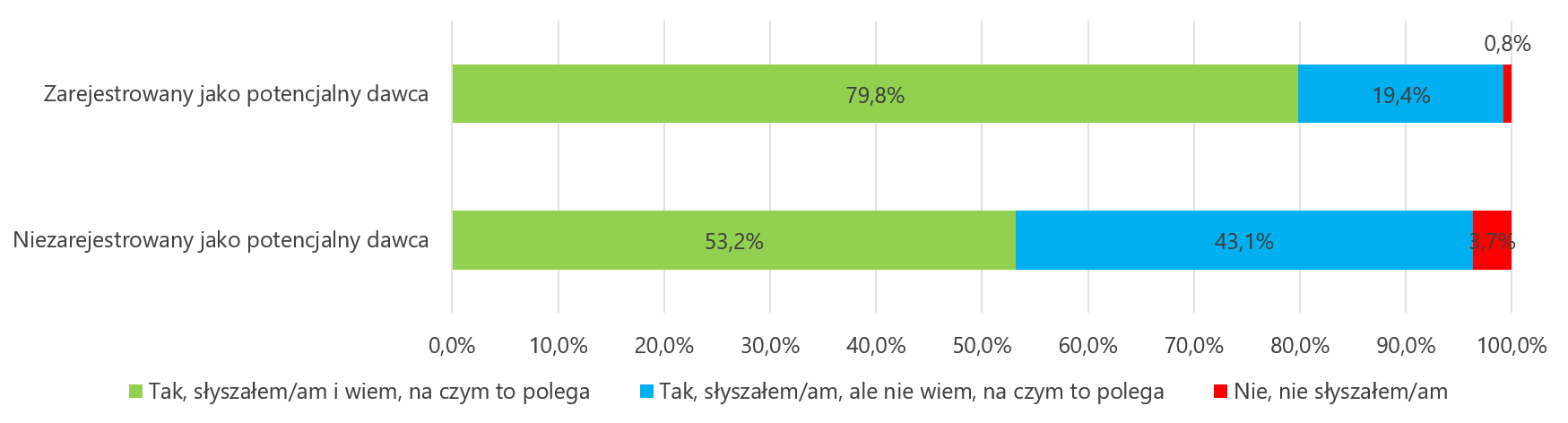 Grupę respondentów, którym zadano pytania, tworzyły zarówno osoby, które już są zarejestrowane jako potencjalni Dawcy szpiku, jak i ci, którzy jeszcze nie zdecydowali się na ten krok. Ankietowani – zarejestrowani potencjalni Dawcy - zdecydowanie częściej, niż osoby niezarejestrowane wskazywali, że słyszeli i wiedzą, na czym polega idea dawstwa – taką odpowiedź wskazało 80 proc.Dawców potencjalnych. W przypadku osób niezarejestrowanych - 53 proc. zadeklarowało, że słyszało i potrafi powiedzieć, czym jest dawstwo szpiku, natomiast 43 proc. niezarejestrowanych wskazało, że słyszeli o idei, ale nie wiedzą, z czym się ona wiąże.