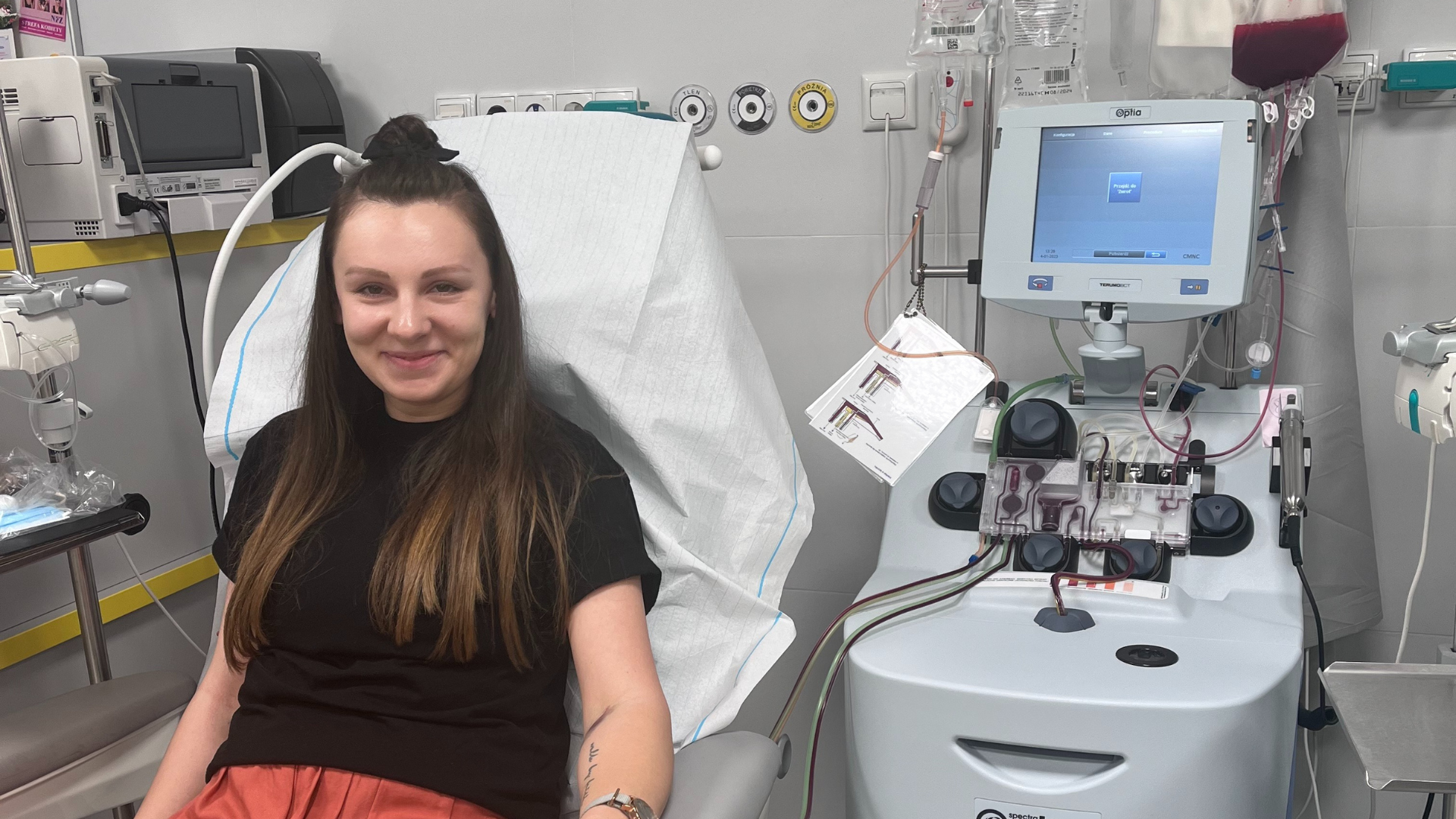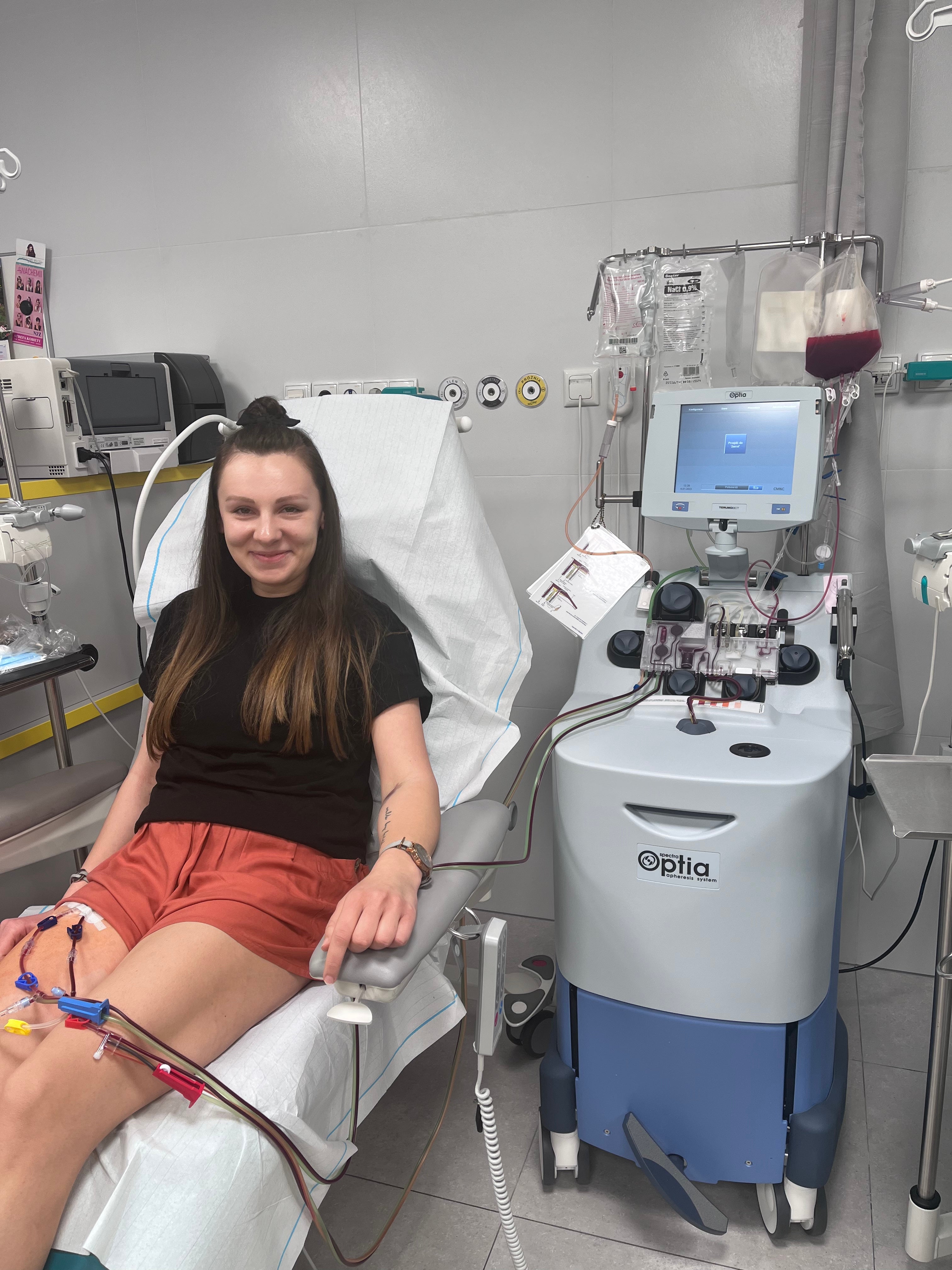 W 2022 roku Fundacja DKMS odezwała się do mnie ponownie. Kolejny „genetyczny bliźniak", a raczej bliźniaczka potrzebowała mojej pomocy. Nie mogłam w to uwierzyć, bo zdarzają się nieliczne przypadki powtórnego dopasowania z kolejnym Biorcą. Po przejściu wszystkich badań ustalono datę pobrania, tym razem z krwi odwodowej. Pobranie odbywało się dwa dni. Pierwszego dnia nie udało się zebrać odpowiedniej ilości materiału i zakładanie kolejnych wenflonów było problematyczne, więc drugiego dnia zastosowano wkłucie centralne, co okazało się dużo lepszą metodą.