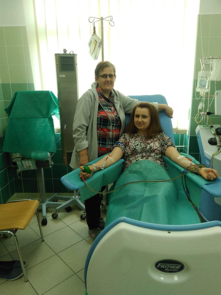 Na oddanie komórek z krwi obwodowej pojechała ze mną oczywiście Mama. Miałyśmy okazję jak nigdy porozmawiać ze sobą, spędzić trochę czasu inaczej niż na co dzień. Po oddaniu komórek przyznała mi się, że strasznie się tego bała. Wyobrażała sobie, że będę leżeć pod plątaniną kabli, że będę „ledwo żywa”, że cała rekonwalescencja będzie długa. Wszystko poszło niezwykle sprawnie. Badania krwi wyszły prawidłowe, szybko zostałam podłączona do separatora, Mama zasiadła obok mnie i dopingowała. Wówczas w mojej głowie zaczęło postępować niezwykłe przeobrażenie. Dopiero wtedy wszystko dotarło do mnie, że właśnie ratuję komuś życie, że gdzieś jest Ktoś, kto czeka na moje komórki, że może Rodzina modli się aby wszystko poszło pomyślnie. I gdy patrzyłam jak tych komórek jest coraz więcej i więcej, uświadomiłam sobie, że tak nie wiele potrzeba by Komuś życie przedłużyć, by wyzwolić go z koszmaru choroby, by ponownie był w domu z najbliższymi. Oddałam ich około 220ml – niepełna szklanka. I proszę zobaczyć jak sprawdza się powiedzenie, że życie to najcenniejszy dar, że zdrowia nie można kupić. Gdybym w ten woreczek włożyła w darze pieniądze – nie uratowałabym Tej osoby. Owszem, pieniądze mają ogromną wartość i zdaję sobie z tego sprawę – cała procedura i leczenie jest niezwykle kosztowne ale to nie one same w sobie są najcenniejsze.