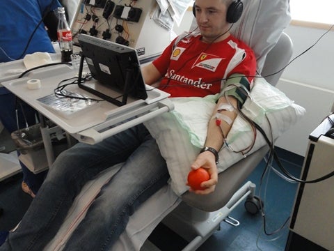 W końcu nadszedł dzień pobrania. Był to mroźny kwietniowy poranek, godz. 8.00, wtedy to zostałem podłączony do maszyny. Widziałem jak komórki gromadzą się w woreczku i trudno było mi uwierzyć, że tylko tyle wystarczy zrobić, by pomóc komuś choremu na białaczkę. Po upływie ok. 4 godzin udało się uzbierać wystarczającej ilości komórek. Czas ten upłynął mi bardzo szybko przy filmie, w towarzystwie mojej żony Anny i córki Zuzi oraz tłumacza pana Macieja Luchowskiego, który pomagał w komunikacji z rewelacyjnym personelem kliniki. Samo pobranie jest bezbolesne i od razu po nim wychodzi się z kliniki.