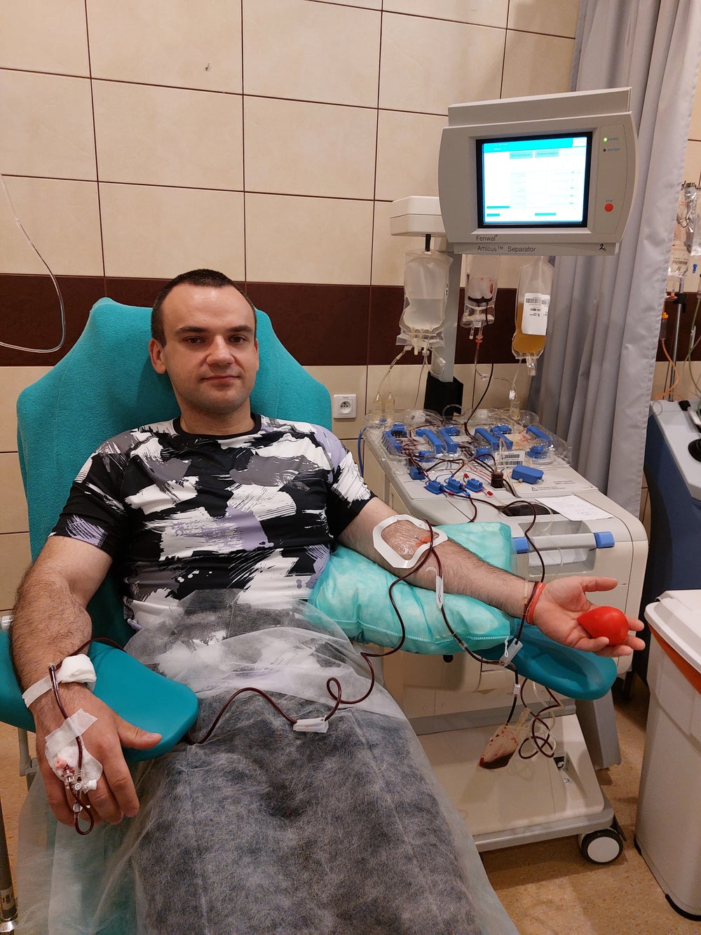 I przyszedł ten czas, dzień przed pobraniem przyjechałem z osobą towarzyszącą do hotelu (wszystko opłaca DKMS! hotel, dojazd oraz wyżywienie dawcy). Hotel był opłacony na 2 dni, ponieważ 1 na 10 przypadków nie udaje się pobrać tyle komórek, ile potrzeba i wtedy trzeba przyjechać na następny dzień do kliniki znowu. W moim przypadku wystarczyło tylko raz. Cała procedura przebiegała w bardzo miłej atmosferze. Na następny dzień dostałem informację telefoniczną od koordynatora czy chcę poznać płeć, orientacyjny wiek Biorcy oraz narodowość. Była to kobieta w średnim wieku. Cała procedura pobrania odbyła się w czerwcu 2023r.