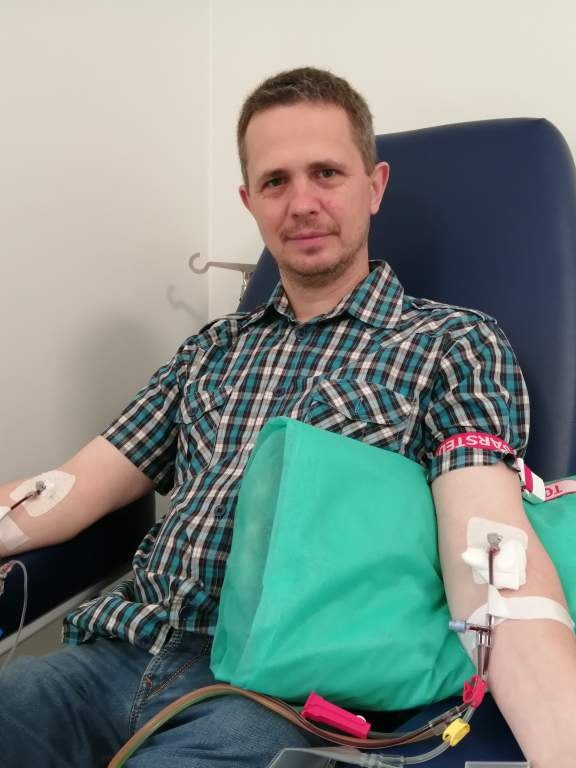 To była wiadomość z efektem WOW i jedyne co mogłem powiedzieć to oczywiście, że jestem gotów. Najpierw badania potwierdzające – zgodne, potem oczekiwanie na dalsze informacje, chwilowe zatrzymanie procedury ze względu na stan zdrowia pacjenta. Po jakimś czasie dostałem telefon z pytaniem czy nadal jestem gotów, oczywiście potwierdziłem. Badania kwalifikacyjne, wszystko było w porządku i zostałem zakwalifikowany. W końcu nadszedł dzień pobrania. Na zabieg pojechałem z córką. Na fotelu spędziłem około cztery i pół godziny obserwując jak w worku zbierają się komórki. Wspaniała opieka personelu, co chwilę pytanie czy wszystko ok i czy dobrze się czuję.