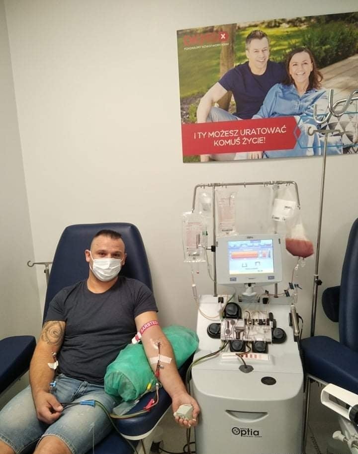 W dniu pobrania rano zgłosiłem się do kliniki. Atmosfera tam panująca momentalnie pozbawiła mnie całego stresu. Pobranie trwało niecałe 4 godziny. Podczas niego miałem możliwość korzystania z telefonu, w tym czasie przez maszynę przepłynęło ponad 21l mojej krwi (ponad 4 razy tyle co posiadamy), aby wyodrębnić 500ml płynnego złota ratującego życie.