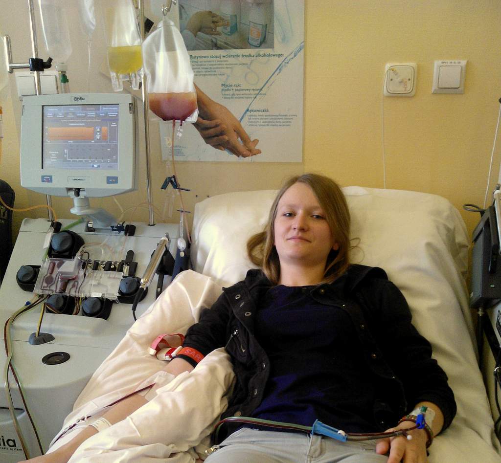Po około 1,5 roku od rejestracji otrzymałam telefon o możliwej zgodności i potrzebie pomocy choremu. Po przebytych badaniach wstępnych otrzymałam decyzję, że mogę oddać komórki macierzyste z krwi obwodowej. Niestety pierwszy termin został odwołany z powodu złego stanu zdrowia biorcy. Przez kolejne 2 miesiące żyłam w ciągłej niepewności, czy będzie mi dane pomóc mojemu bliźniakowi i jak poważny jest jego stan. Jednak wreszcie otrzymałam telefon z prośbą o ponowne stawienie się na badania, wyznaczony został kolejny termin oddania komórek macierzystych, który tym razem odbył się bez przeszkód. Na kilka dni przed zabiegiem przyjmowałam czynnik wzrostu, który zdecydowałam się podawać sobie sama. Byłam przerażona faktem wykonywania zastrzyków, ale pomogła mi Pani pielęgniarka i wspólnie śmiałyśmy się z mojej niepotrzebnej paniki. Po kilku zastrzykach odczuwałam ból w kościach w okolicy lędźwiowej, przypominający „łamanie w kościach” podczas grypy, który nie utrudniał mi jednak fizycznej pracy. Pierwszego dnia zabieg trwał u mnie 4 godziny, ale nie udało się zebrać wystarczającej ilości komórek i konieczny był przyjazd drugiego dnia, tym razem na 3,5 godz. Przez cały ten czas (łącznie z przyjazdami na badania) opiekował się mną wspaniały personel medyczny z Kliniki, na który zawsze mogłam liczyć! Dzięki nim pobyt na oddziale sprawiał, że zapominałam, iż jestem w szpitalu. Wszelkie wątpliwości związane z całą procedurą rozwiewał także Pan Łukasz z Fundacji DKMS, któremu dziękuję za troskę i cierpliwość.