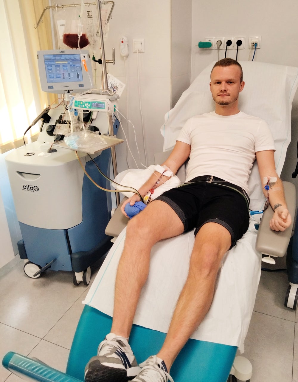 Natychmiast odpisałem, że nadal jestem gotowy do pomocy. Myślałem nawet, że będę musiał skrócić swój wyjazd, ale okazało się, że kolejny etap może potrwać nawet do trzech miesięcy. W moim przypadku był to tylko miesiąc. Przeszedłem pomyślnie wszystkie badania, a następnie po tygodniu siedziałem już wygodnie podłączony do aparatury, która z jednej ręki odpompowywała krew, a do drugiej wpompowywała ją pobierając przy tym komórki macierzyste.