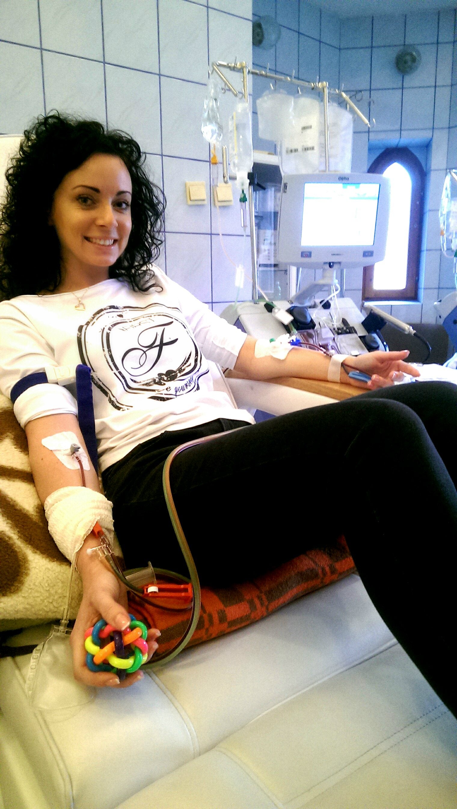 25 lutego 2015 r., wraz z mężem zjawiliśmy się w zarezerwowanym przez Fundację hotelu we Wrocławiu i niecierpliwie czekaliśmy, aż wybije „godzina 0”. Następnego dnia rano, personel kliniki podłączył mnie do maszyny separującej komórki i rozpoczął się cały proces. Lekki stres ustąpił zupełnie, gdy po paru minutach od rozpoczęcia pobrania przekonałam się „na własnej skórze”, że to kompletnie nic nie boli. Co więcej – poczułam nawet ogromną ulgę, gdyż zupełnie przestały mnie „łamać kości”, które to uczucie towarzyszyło mi przez kilka poprzednich dni. Po zakończonym pobraniu dostałam informację, że zachodzi potrzeba zjawienia się w klinice następnego dnia, celem powtórzenia zabiegu, gdyż pomiędzy mną, a biorcą istnieje znaczna różnica wagowa. Tak więc, zaopatrzona w dwa ostatnie zastrzyki czynnika wzrostu udałam się do hotelu i rankiem następnego dnia, znów siedziałam w wygodnym fotelu w klinice, podłączona do separatora komórek. Całe dwa dni pobrania przeminęły w niezwykle miłej i przyjaznej atmosferze, zarówno ze strony personelu, jak i pacjentów szpitala.