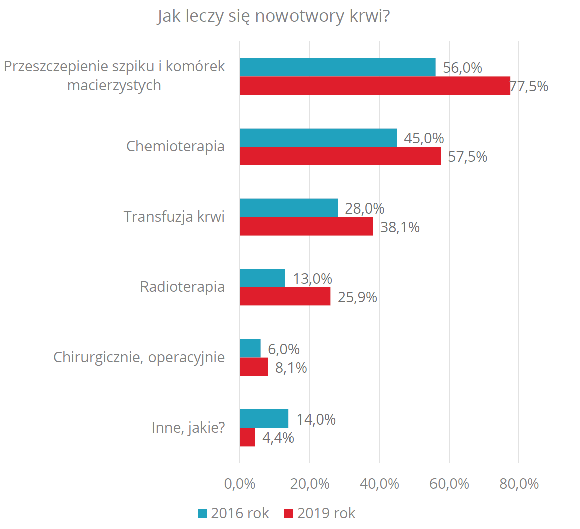 Ponad połowa ankietowanych była zdania, że nowotwory krwi są uleczalne, zależy to jednak od wielu czynników. Wysoka okazała się także znajomość metod leczenia tych nowotworów. Ponad 3/4 badanychwskazało, że jedną z metod leczenia jest przeszczepienie szpiku (w 2016 roku było to tylko 56 proc.), a ponad połowa wskazała na chemioterapię. Optymizmem napawa też fakt, że błędną odpowiedź, jaką jest leczenie operacyjne, wybrał najmniejszy odsetek respondentów – 8,1 proc.Jednostkowe okazały się także wskazania na niebezpieczne próby leczenia nowotworów krwi, czyli metody niekonwencjonalne, takie jak zioła czy dieta bogata w antyoksydanty. A co z profilaktyką? Chociaż ponad połowa badanych wiedziała, że nowotwory krwi można wykryć dzięki badaniu krwi, to niepokój wzbudza fakt, że aż 133 osoby (na 1000) nie wiedziały w ogóle jak to zrobić. Odpowiedzi pokazują, jak ważne jest prowadzenie działań edukacyjnych na temat profilaktyki tych nowotworów. Zwłaszcza, że jest to choroba „niezawiniona” - dotyka także osoby, które dbają o zdrowie i unikają używek.