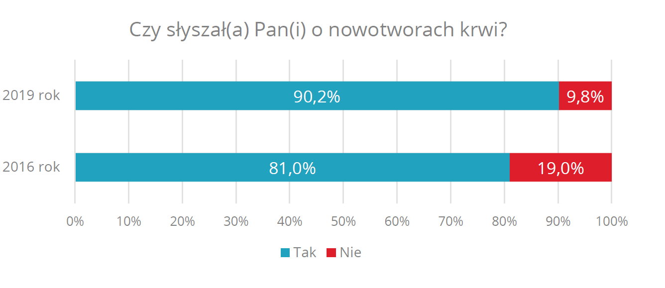 90 proc. Polaków, którzy wzięli udział w badaniu Biostat, słyszało o nowotworach krwi. Jednak wciąż co 3. osoba utożsamia nowotwory krwi wyłącznie z białaczką, ale i w tym obszarze zaszła pozytywna zmiana, ponieważ jeszcze trzy lata temu aż 60 proc.respondentów łączyło nowotwór krwi tylko z tą chorobą. Największa wiedza o tym, że nowotwory krwi to nie tylko białaczka, widoczna jest u osób w przedziale wiekowym 18-29 lat – 66 proc. wie, że do grupy nowotworów krwi zalicza się wiele innych chorób, np. chłoniaki czy szpiczak.