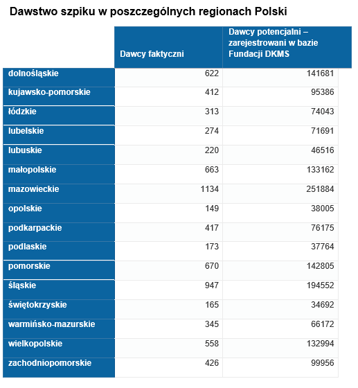 Aktualnie w bazie Dawców szpiku Fundacji DKMS zarejestrowanych jest ponad 1,6 mln. osób, spośród których - na przestrzeni 10 lat - szpik lub krwiotwórcze komórki macierzyste oddały już 7594 osoby. W samym 2019 roku 1336 osób dało szansę na życie chorym, dla których przeszczepienie szpiku było często jedyną szansą na powrót do zdrowia. 1127 Dawców faktycznych oddało cząstkę siebie za pomocą częściej stosowanej – bo w aż 80% przypadków - metody, czyli pobrania krwiotwórczych komórek macierzystych z krwi obwodowej (tzw. aferezy). Pozostałych 209 Dawców faktycznych oddało szpik kostny z talerza kości biodrowej.