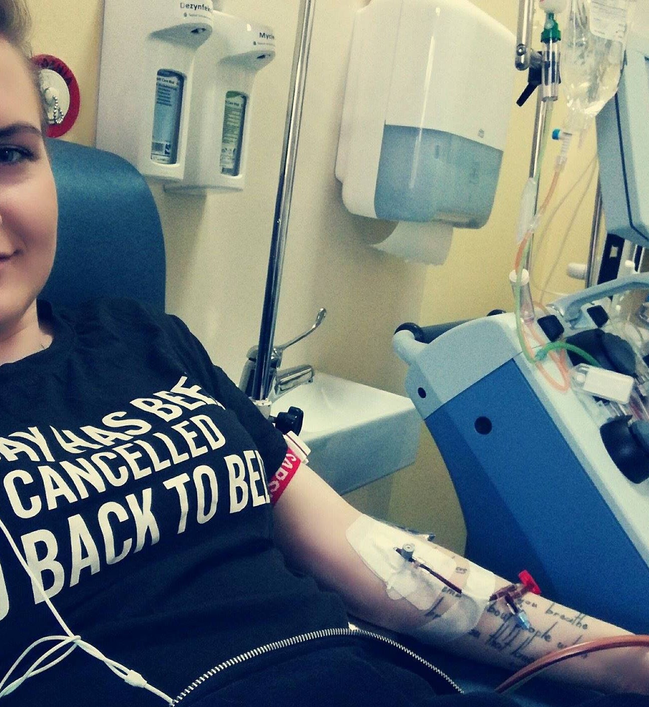 Kilka dni później pojechałam do kliniki z asekuracją przyjaciółki i ogromem ludzi którzy czekali na telefon ode mnie. Tak to był ten wielki dzień, przywitałam panie pielęgniarki z uśmiechem i usiadłam na fotelu na którym miałam spędzić najbliższe kilka godzin. Opowiedziałam ich o moich efektach ubocznych, panie pobrały mi krew i poszły ją zbadać. Po 15 min. wróciły, jedna z nich spojrzała na kartkę z moimi wynikami, następnie spojrzały na siebie, na kartkę i na mnie. W mojej głowie było już milion myśli: coś jest nie tak, jest jakiś problem. Szybko mnie wyprowadziły z błędu, że nic dziwnego, że mnie wszystko boli, norma leukocytów we krwi człowieka to jakieś 4 -7 tys. W mojej krwi było ich obecnie 100 tys. Byłam rekordzistką. Bardzo szybko ból ustąpił, po podłączeniu mnie, wszystko ustąpiło, przestało mieć znaczenie.