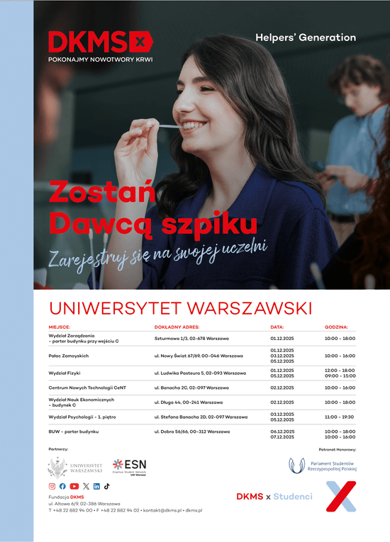 Studenci z całej Polski ponownie łączą siły, by dać chorym na nowotwory krwi szansę na życie. 💪 Dzięki tej niesamowitej inicjatywie, wspólnie z Fundacją DKMS, udało się zarejestrować już niemal 180 tys. potencjalnych Dawców.