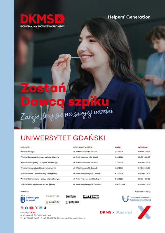 Przed nami odsłona jesienna XVI edycji projektu studenckiego HELPERS’ GENERATION! 🎓❤️ Studenci z całej Polski łączą siły w walce z nowotworami krwi, a ich dotychczasowa ponad 10-letnia współpraca z Fundacją DKMS poskutkowała rejestracją 163 000 nowych potencjalnych Dawców. Już w grudniu na 57 uniwersytetach odbędą się akcje rejestracji do bazy Fundacji DKMS!