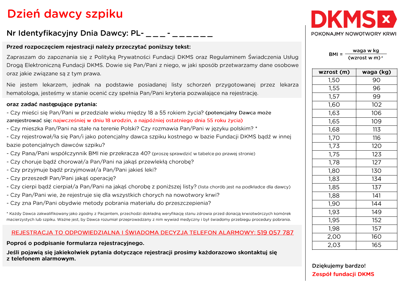 Kod Dnia Dawcy - upewnij się, że go znasz. Dedykowany Twojej akcji kod dnia dawcy znajdziesz w mailu od koordynatora, oraz na nalepce na kartonie z materiałami rejestracyjnymi. Zaczyna się od literek PL, ma łącznie 9 znaków, z czego trzy ostatnie to cyfry.