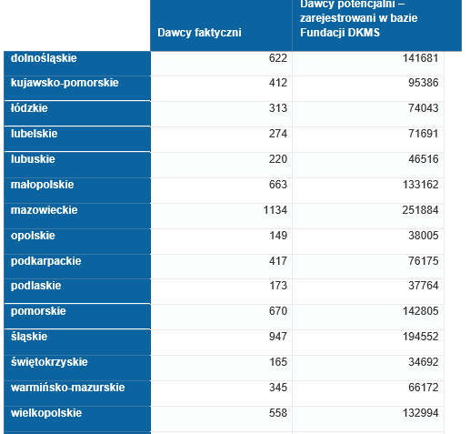 Aktualnie w bazie Dawców szpiku Fundacji DKMS zarejestrowanych jest ponad 1,6 mln. osób, spośród których - na przestrzeni 10 lat - szpik lub krwiotwórcze komórki macierzyste oddały już 7594 osoby. W samym 2019 roku 1336 osób dało szansę na życie chorym, dla których przeszczepienie szpiku było często jedyną szansą na powrót do zdrowia. 1127 Dawców faktycznych oddało cząstkę siebie za pomocą częściej stosowanej – bo w aż 80% przypadków - metody, czyli pobrania krwiotwórczych komórek macierzystych z krwi obwodowej (tzw. aferezy). Pozostałych 209 Dawców faktycznych oddało szpik kostny z talerza kości biodrowej.