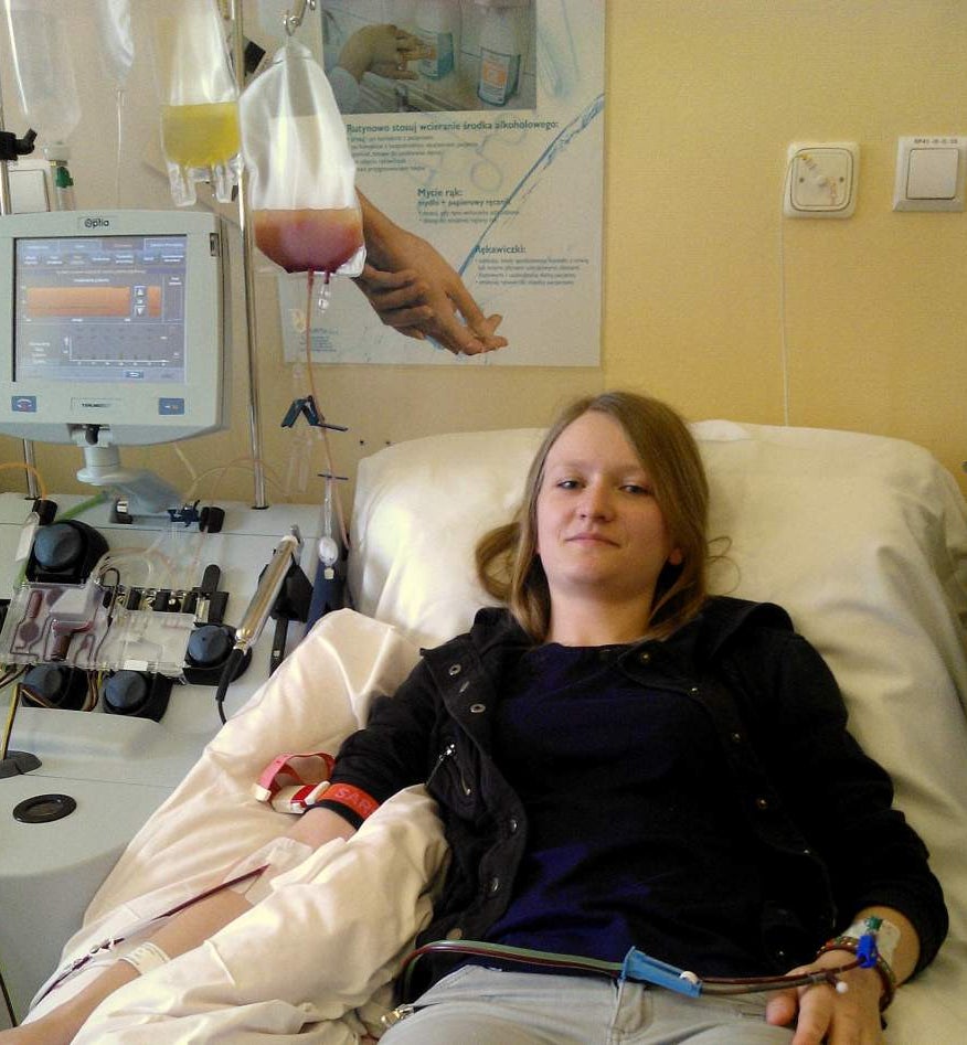 Po około 1,5 roku od rejestracji otrzymałam telefon o możliwej zgodności i potrzebie pomocy choremu. Po przebytych badaniach wstępnych otrzymałam decyzję, że mogę oddać komórki macierzyste z krwi obwodowej. Niestety pierwszy termin został odwołany z powodu złego stanu zdrowia biorcy. Przez kolejne 2 miesiące żyłam w ciągłej niepewności, czy będzie mi dane pomóc mojemu bliźniakowi i jak poważny jest jego stan. Jednak wreszcie otrzymałam telefon z prośbą o ponowne stawienie się na badania, wyznaczony został kolejny termin oddania komórek macierzystych, który tym razem odbył się bez przeszkód. Na kilka dni przed zabiegiem przyjmowałam czynnik wzrostu, który zdecydowałam się podawać sobie sama. Byłam przerażona faktem wykonywania zastrzyków, ale pomogła mi Pani pielęgniarka i wspólnie śmiałyśmy się z mojej niepotrzebnej paniki. Po kilku zastrzykach odczuwałam ból w kościach w okolicy lędźwiowej, przypominający „łamanie w kościach” podczas grypy, który nie utrudniał mi jednak fizycznej pracy. Pierwszego dnia zabieg trwał u mnie 4 godziny, ale nie udało się zebrać wystarczającej ilości komórek i konieczny był przyjazd drugiego dnia, tym razem na 3,5 godz. Przez cały ten czas (łącznie z przyjazdami na badania) opiekował się mną wspaniały personel medyczny z Kliniki, na który zawsze mogłam liczyć! Dzięki nim pobyt na oddziale sprawiał, że zapominałam, iż jestem w szpitalu. Wszelkie wątpliwości związane z całą procedurą rozwiewał także Pan Łukasz z Fundacji DKMS, któremu dziękuję za troskę i cierpliwość.