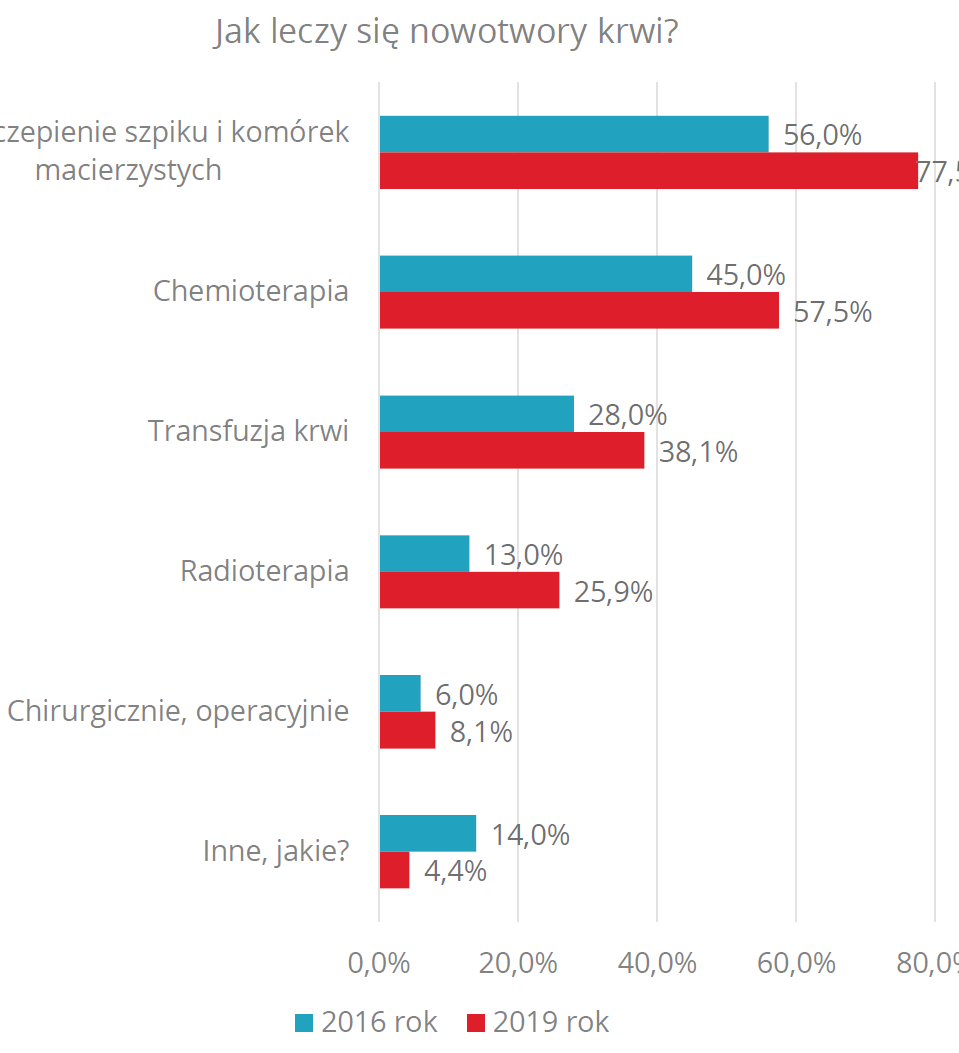 Ponad połowa ankietowanych była zdania, że nowotwory krwi są uleczalne, zależy to jednak od wielu czynników. Wysoka okazała się także znajomość metod leczenia tych nowotworów. Ponad 3/4 badanychwskazało, że jedną z metod leczenia jest przeszczepienie szpiku (w 2016 roku było to tylko 56 proc.), a ponad połowa wskazała na chemioterapię. Optymizmem napawa też fakt, że błędną odpowiedź, jaką jest leczenie operacyjne, wybrał najmniejszy odsetek respondentów – 8,1 proc.Jednostkowe okazały się także wskazania na niebezpieczne próby leczenia nowotworów krwi, czyli metody niekonwencjonalne, takie jak zioła czy dieta bogata w antyoksydanty. A co z profilaktyką? Chociaż ponad połowa badanych wiedziała, że nowotwory krwi można wykryć dzięki badaniu krwi, to niepokój wzbudza fakt, że aż 133 osoby (na 1000) nie wiedziały w ogóle jak to zrobić. Odpowiedzi pokazują, jak ważne jest prowadzenie działań edukacyjnych na temat profilaktyki tych nowotworów. Zwłaszcza, że jest to choroba „niezawiniona” - dotyka także osoby, które dbają o zdrowie i unikają używek.